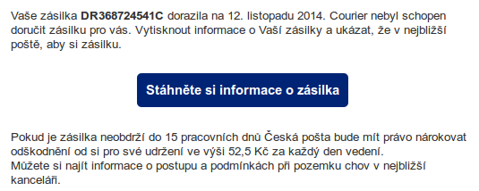 Bezpečnostný tým CSIRT.CZ obdržal varovanie o ďalšej vlne podvodných e-mailov, ktoré informujú užívateľov o doručení zásielky. Podvodné e-maily sa doručujú z adries nepatriacich Českej pošte ako napríklad support@cs-post.net, tracktrace@cs-post.net, cpost@cs-post.net, post@cs-post.net, zasilka@cs-post.net. Po odkliknutí na odkaz v tele mailu sú užívatelia presmerovaný na falošné stránky Českej pošty, kde po odpísaní CAPTCHY môžu stiahnuť .ZIP súbor s priloženým .EXE súborom. Ten zašifruje všetky dokumenty na disku a pre rozšifrovanie vyžaduje zaplatenie tzv. ransomwaru (výkupného). Ransomware sa podľa našich informácií zameriava primárne na platformy Windows a okrem AVG nieje zatiaľ detekovaný ako škodlivý žiadnymi inými vačšími antivírovými spoločnostiami.
